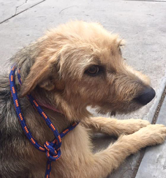 | Perrita encontrada en Surquillo. Tiene un lazo rosado y una soga azul. |