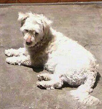 Es una perrita viejita con una cicatriz en el estómago, es de raza pequeña y color blanco.