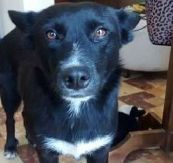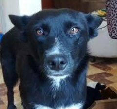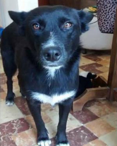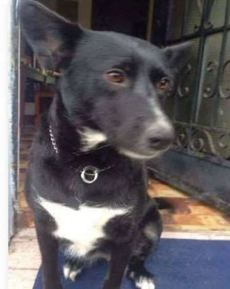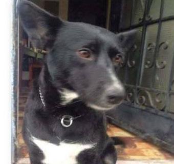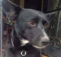 | Es negra, mediana-grande, con orejas en punta, con manchas blancas en el pecho y en la punta de sus patas. Lleva collar estilo cadena color plateado, es dócil y buena. |